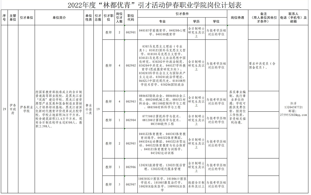 2022年度“林都优青”引才活动伊春职业学院岗位计划表