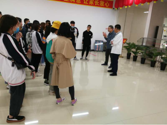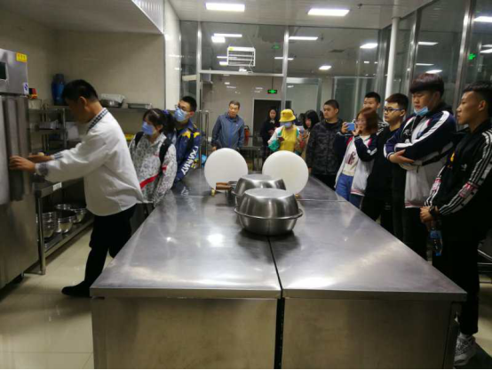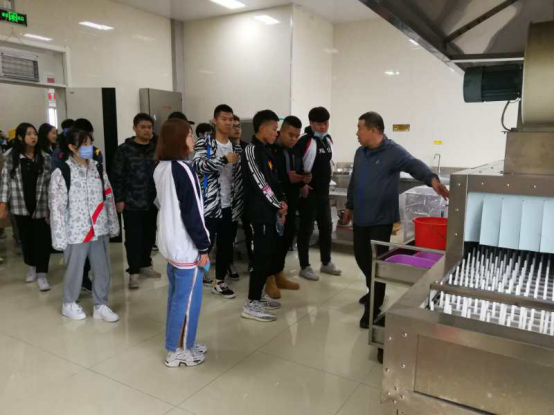 会后学生对食堂厨房餐具的洗消、主副食品的制作流程进行全程参观,并了解了采购、食品留样等相关内容。