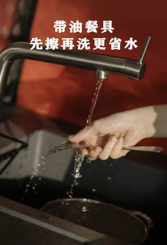 餐具清洗方面,油污先用纸或抹布擦除,再热洗一遍,最后才用稍多的温水或冷水洗干净。用淘米水、煮面汤、过夜茶清洗碗筷,既可去油,又可节水、减少洗洁精污染。