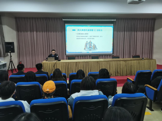 首先,政保大队王警官从什么是邪教、邪教与宗教的区别、邪教的危害、如何识别邪教、防范邪教方面进行讲解与交流。他说,同学们要从自身做起远离邪教,树立抵制邪教、崇尚科学的坚定信念,切实增强自身的免疫力,自觉抵制邪教,做到不听、不信、不传播邪教,坚决同邪教组织做斗争。