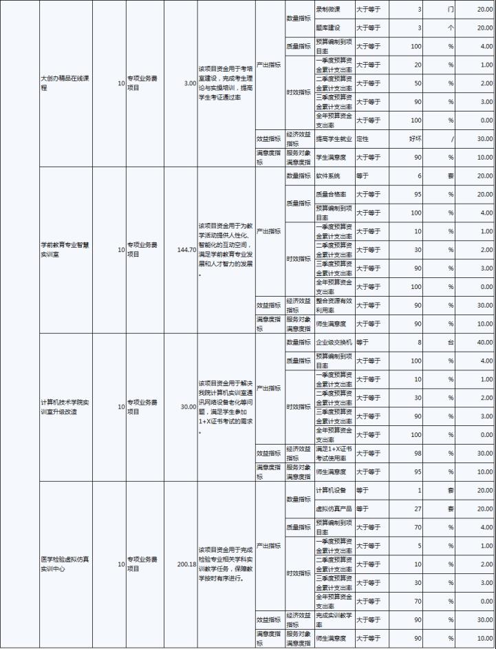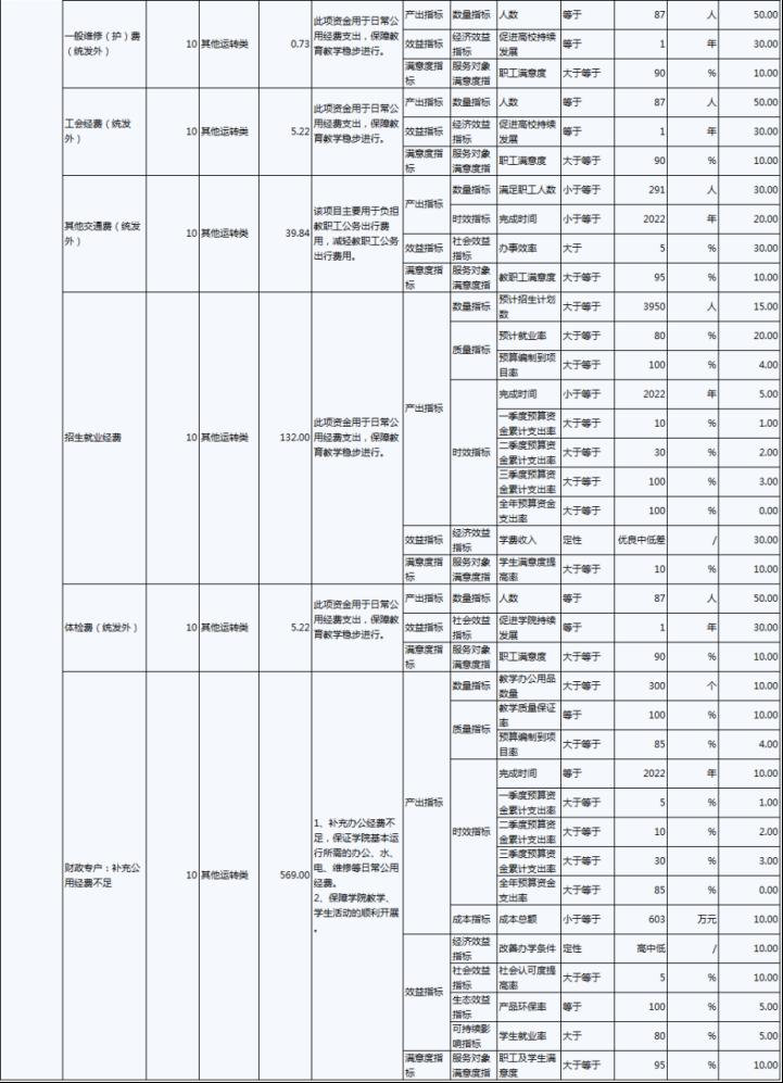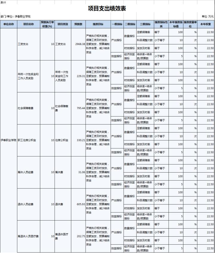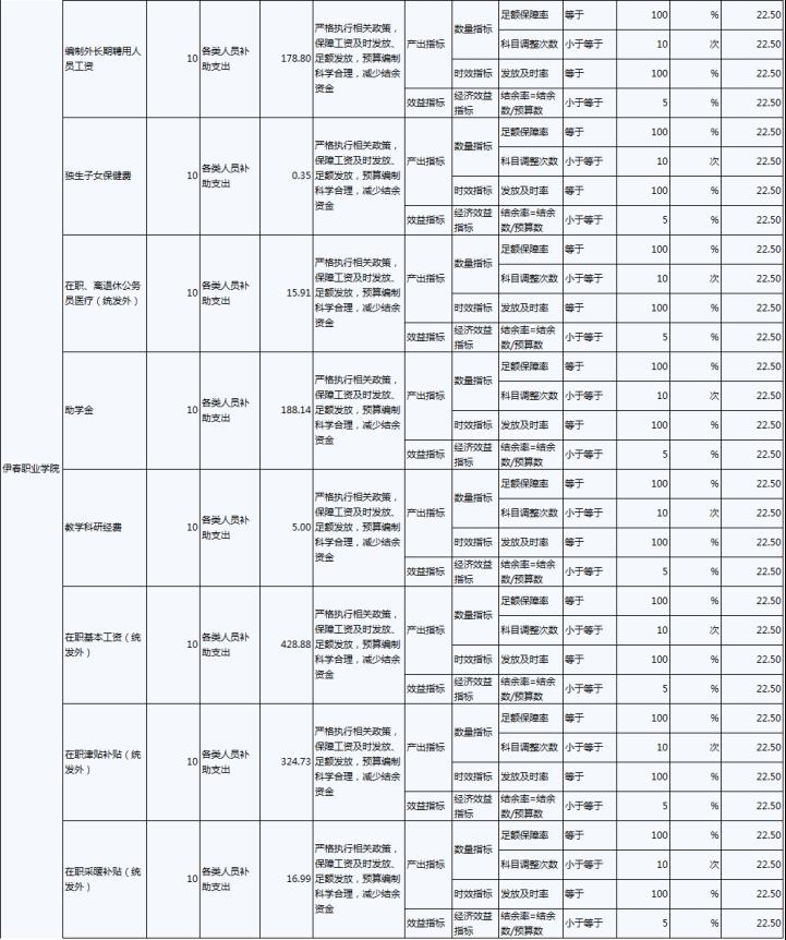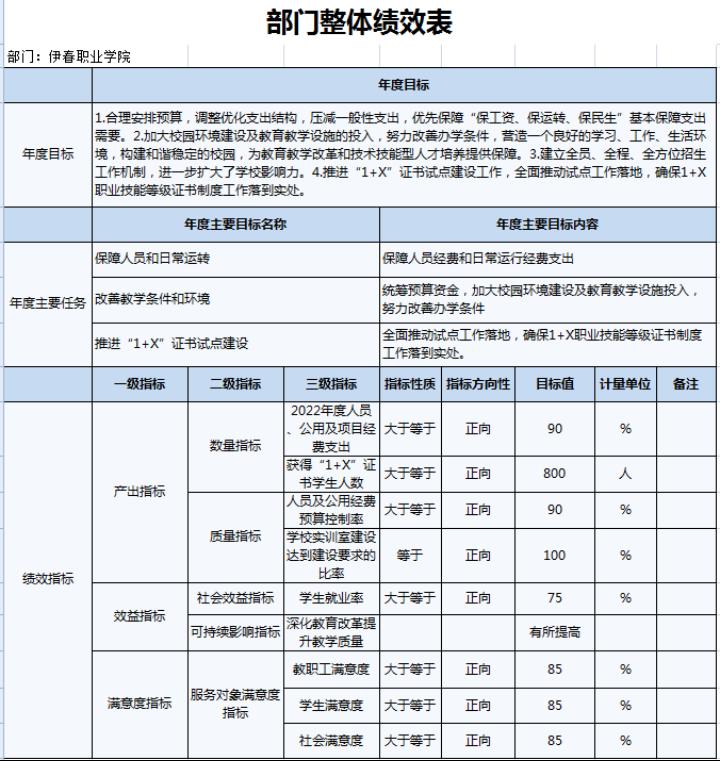 2022年,伊春职业学院年度绩效目标为:优先保障“保工资、保运转、保民生”基本保障支出需要;加大校园环境建设及教育教学设施的投入,努力改善办学条件;建立全员、全程、全方位招生工作机制;.推进“1+X”证书试点建设工作,全面推动试点工作落地。完成实训室改造、“1+X”证书试点建设、招生就业工作等30项重点工作,主要绩效指标及指标值情况为年度人员、公用及项目经费支出率大于等于90%;获得“1+X”证书学生人数大于等于800人;人员及公用经费预算控制率大于等于90%;学校实训室建设达到建设要求的比率等于100%;学生就业率大于等于70%;深化教育改革提升教学质量有所提高;教职工满意度大于等于85%;学生满意度大于等于85%;社会满意度大于等于85%。