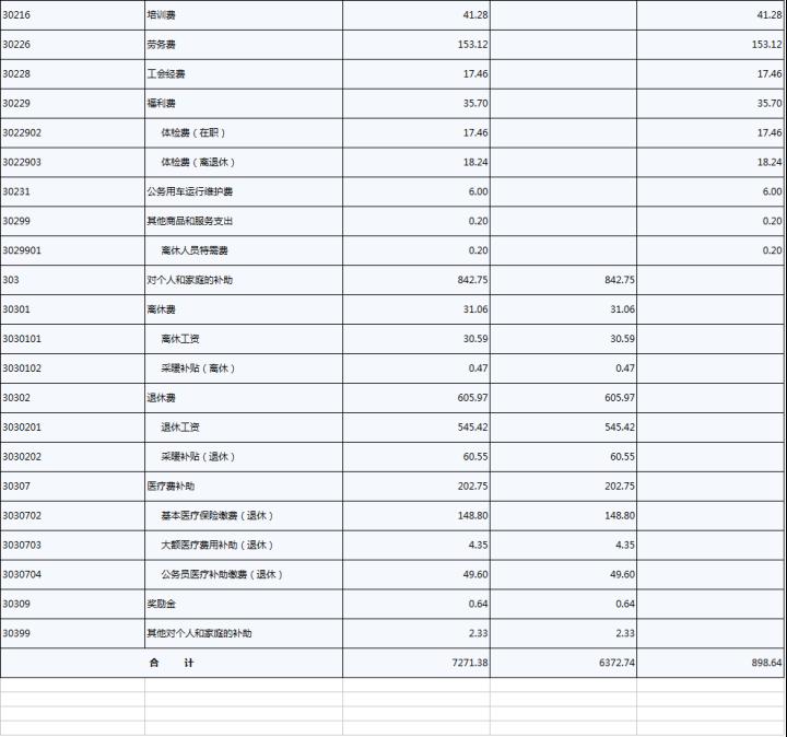 2、商品服务支出898.64万元。与上年预算相比减少51.3万元。主要原因是办公费11.45万元。比上年预算减少4.94万元;水电费14.56万元。比上年预算减少4.99万元;邮电费17.31万元。比上年预算减少5.95万元;差旅费56.08万元。比上年预算减少31.56万元;培训费41.28万元。比上年预算减少12.09万元;以上减少主要是因为提倡节约,压缩办公经费所致。福利费35.7万元。与上年预算相比增加35.7万元。与上年预算相比减少其他交通费用42.36万元。主要原因是预算科目调整所致。劳务费153.12万元,与上年预算相比增加26.4万元,主要是因为劳务费标准提高所致。