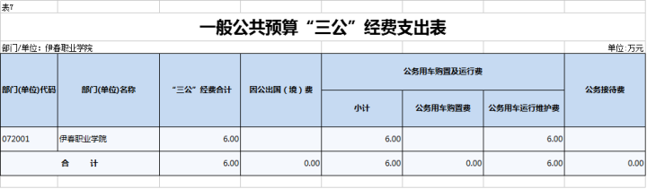 2022年,伊春职业学院一般公共预算“三公”经费支出6.5万元,其中:因公出国(境)费0万元,公务用车购置费0万元,公务用车运行维护费6万元,公务接待费0.5万元。比上年预算持平。