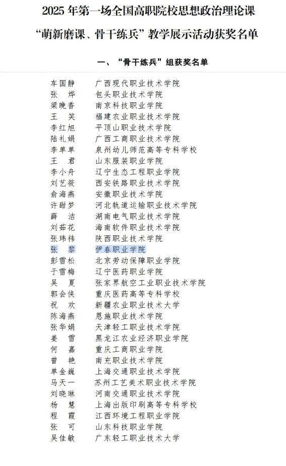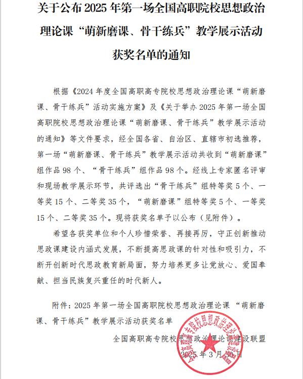 近日,全国高职高专院校思想政治理论课建设联盟公布了2025年全国高职院校思想政治理论课“萌新磨课、骨干练兵”教学展示活动获奖名单思政部张黎老师获《习近平新时代中国特色社会主义思想概论》课程“骨干练兵”组二等奖。
