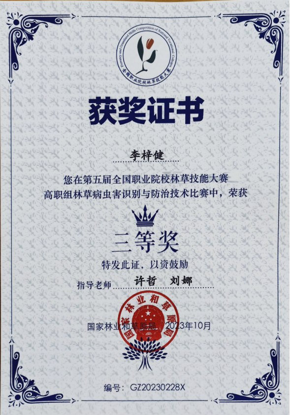 2023年10月25日-27日,由国家林业和草原局主办的第五届全国职业院校林草技能大赛在广西生态工程职业技术学院举行,来自全国86所学校,223名参赛选手参加此次比赛。我校工程应用技术学院林业技术专业2022级学生李梓健参加林草病虫害识别与防治技术(高职组)比赛,经过图片鉴定昆虫种类、标本鉴定病虫害种类、综合防治技术、镜检鉴定病虫害种类、标本制作等5个比赛环节的激烈角逐,荣获大赛三等奖,在我省参赛选手中排名最高。