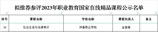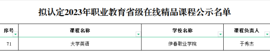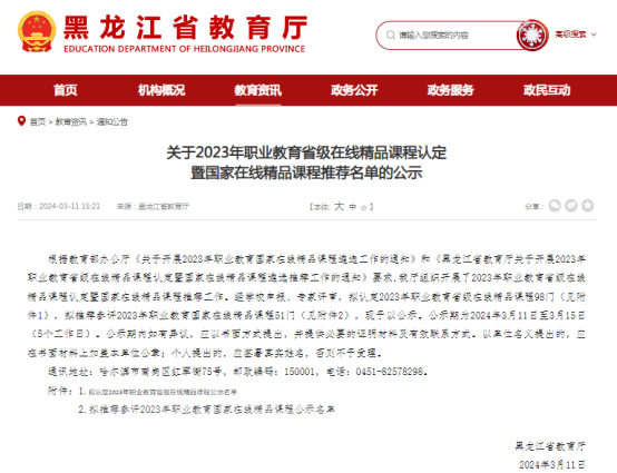 近日,黑龙江省教育厅发布了《关于2023年职业教育省级在线精品课程认定暨国家在线精品课程推荐名单的公示》,公布了黑龙江省2023年职业院校省级在线精品课程认定结果和国家在线精品课程推荐参评名单,我校申报的《社会生活与法律常识》课程被推荐参评2023年职业教育国家在线精品课程,《大学英语》课程被认定2023年职业教育省级在线精品课程。