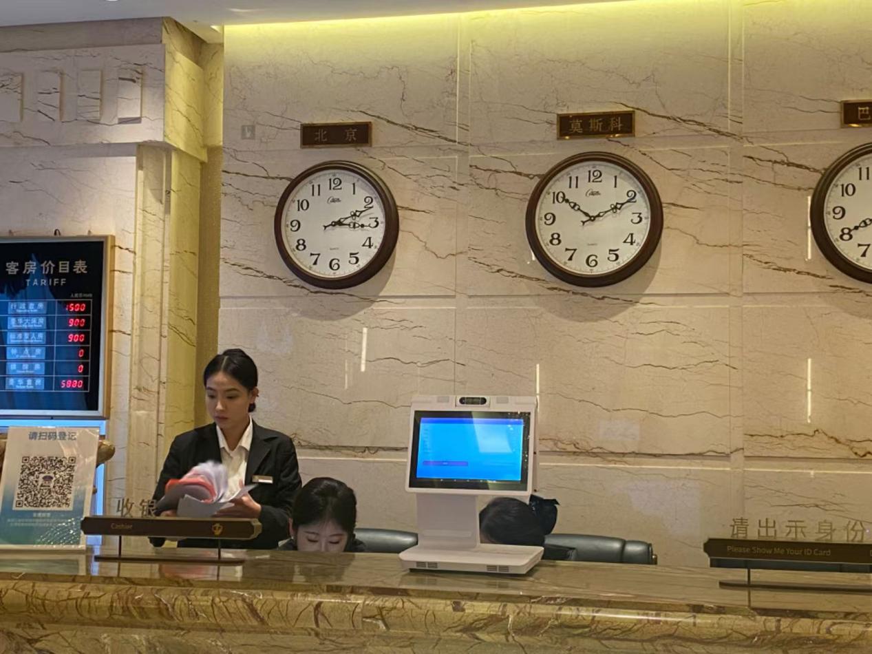 午夜时分,各酒店大厅的迎宾人员、前台工作人员工作热情依然饱满:开门迎宾、安放行李、指引道路,有条不紊地让远道而来的运动员尽早入住酒店房间。