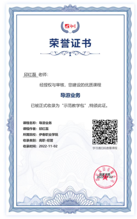 伊春职业学院旅游商务学院邱红磊老师制作的线上课程《导游业务》因教学内容丰富、课程体系合理、讲解条理清楚、学习资料完整,经超星公司组织专家评审,被超星平台专家评为优质课程,正式收录于超星“示范教学包”。