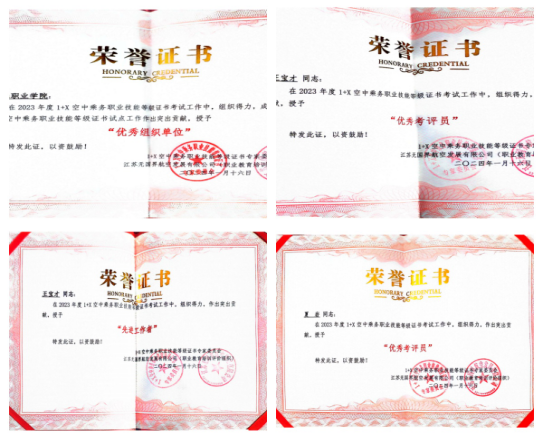 近日,根据《关于表彰教育部1+X空中乘务职业技能等级证书2023年优秀工作单位及先进个人的决定》,由教育部指定的第三方评价组织江苏无国界航空发展有限公司对教育部1+X空中乘务职业技能等级证书2023年度优秀组织单位、优秀考核站点、优秀考评员、先进工作者等进行表彰。我校被评为优秀组织单位、王宝才、夏岩两位考评员老师被评为优秀考评员,王宝才在2023年度考评工作中,考评能力突出,成绩显著,被授予“先进工作者”荣誉称号。