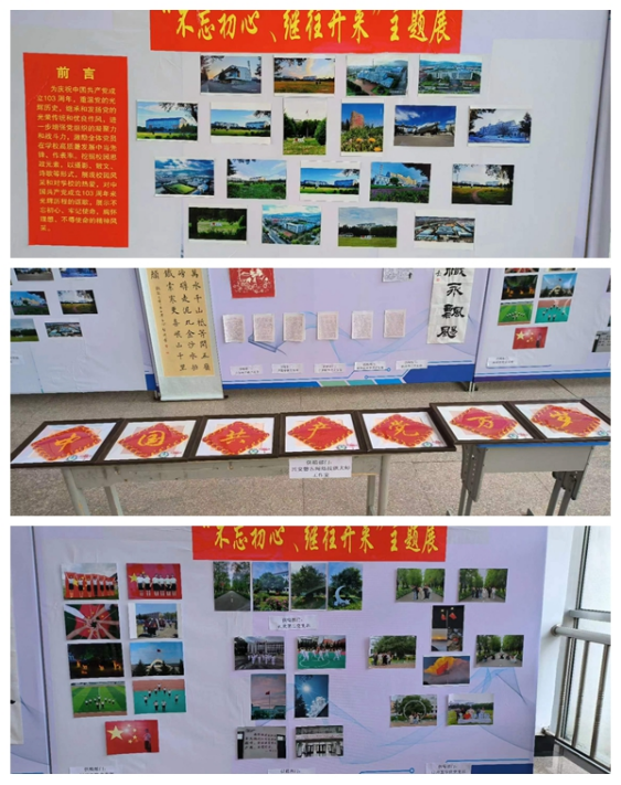 开展“不忘初心、继往开来”主题展。挖掘校园思政元素,以摄影、散文、诗歌等形式,展现校园风采和对学校的热爱,对中国共产党成立 103 周年来光辉历程的讴歌,展示不忘初心、牢记使命,胸怀理想、不辱使命的精神风采。