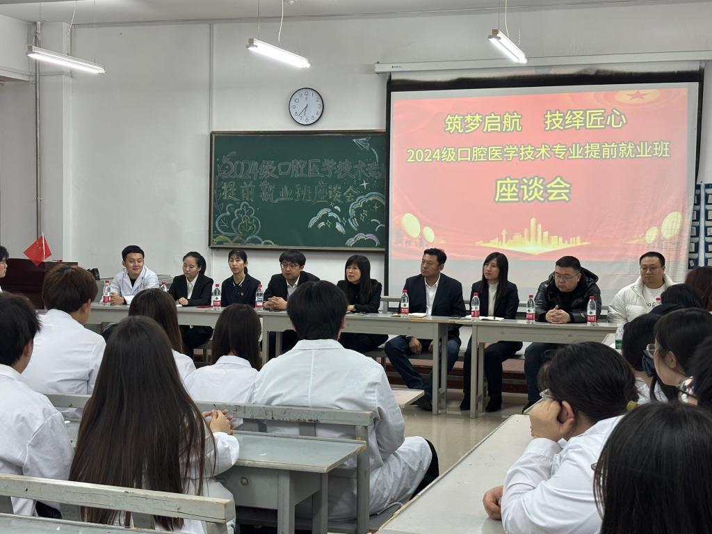 为精准对接行业需求,深化产教融合,助力学生树立正确的就业观与职业理想,口腔医学院于12月3日晚成功召开了以“筑梦启航 技绎匠心”为主题的2024级口腔医学技术专业提前就业班座谈会。师生齐聚一堂,深入交流。