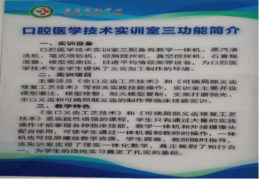 《全口义齿工艺技术》和《可摘局部义齿修复工艺技术》是实践性很强的课程,学生只有通过大量的实践操作才能掌握各种临床技能,教学一体机和外接摄像头配合使用,可使学生通过一体机看到教师的操作,一体机也可投屏播放教学资源,学生跟做,教师随时指导,该实训室实现了理实一体化教学,真正做到了知行合-,为学生的顶岗实习奠定了扎实的基础。