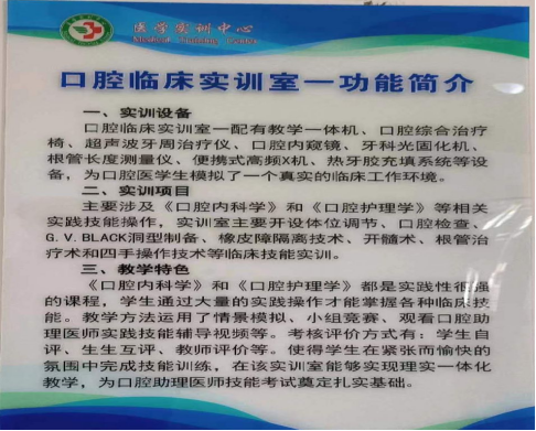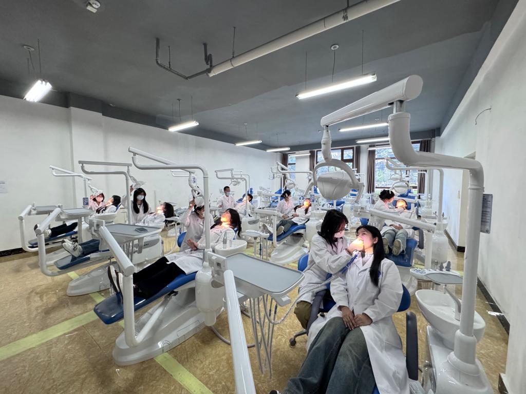 口腔临床实训室配有教学一体机、口腔综合治疗椅、超声波牙周治疗仪、口腔内窥镜、牙科光固化机、根管长度测量仪、便携式高频X机、热牙胶充填系统等设备,为口腔医学生模拟了一个真实的临床工作环境。