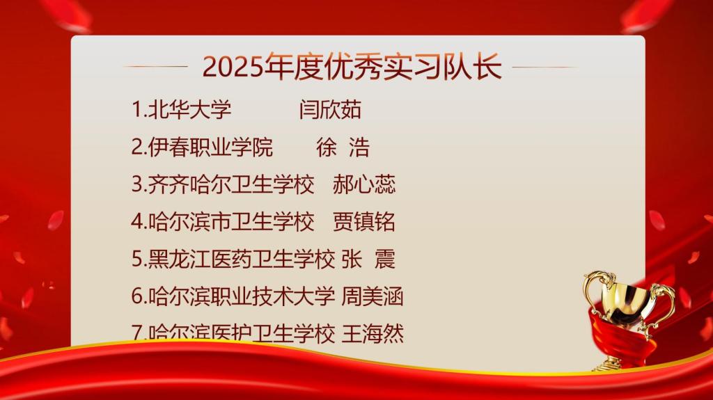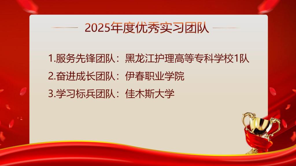 总结会上,哈尔滨医科大学附属第一医院对各实习院校学生的临床实践能力、职业素养等进行了全面考评。伊春职业学院实习团队因表现突出,荣获奋进成长团队奖,这是对学校实习教学质量的高度认可。同时,多名学子脱颖而出,他们的表现赢得了哈尔滨医科大学附属第一医院带教老师的一致好评。
