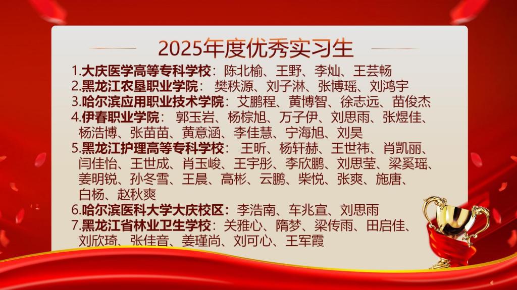 伊春职业学院始终高度重视实习实训环节,与哈尔滨医科大学附属第一医院等多家优质医疗机构建立深度合作关系,为学生搭建了高质量的实践平台。此次获奖不仅是对实习学子的激励,更是学校坚持“以赛促学、以练促能”人才培养理念的生动体现。