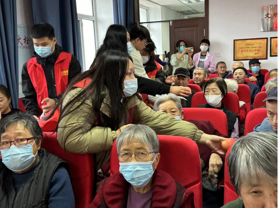 志愿者服务队的同学们带着水果、点心来到福利院,热情地为老人分发,老人们的脸上满是喜悦。