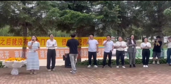 中午放学时分,精彩的节目在教学楼门前拉开帷幕。学生代表深情演唱了《起风了》《北京东路的日子》《不说再见》等歌曲,这些熟悉的旋律勾起了同学们无数美好的回忆,也唱出了大家对校园生活的不舍和对未来实习生活的憧憬。紧接着,全体辅导员们登台,合唱了《再见》和《祝你一路顺风》,他们用歌声表达了对同学们深深的祝福与不舍,现场氛围十分温馨感人。