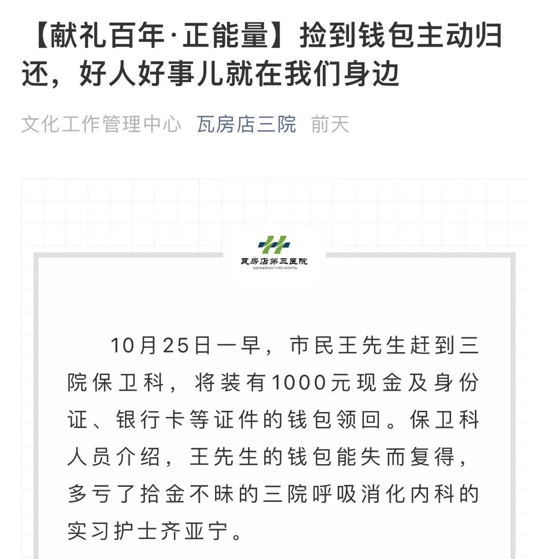 伊春职业学院在人才培养过程中,以立德树人为根本,注重学生德智体美劳全面发展。2021年10月25日,伊春职业学院2017级护理五年制实习生齐亚宁同学在大连瓦房店第三医院实习中,拾金不昧、物归原主,表现出作为一名大学生的高尚品质和良好的道德情操,得到实习所在医院的表扬和社会的赞誉,对我校的人才培养也给予了高度评价。为此,大连瓦房店第三医院作了专门报道,宣传好人好事,传播正能量。