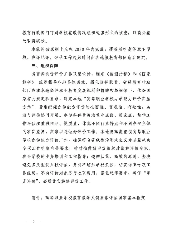 6.贯彻党的教育方针,坚持立德树人,实施三全育人,坚持五育并举,注重劳模精神、劳动精神、工匠精神培养。 7.落实国家职业学校专业人才培养方案编制要求,培养目标明确、培养方案合理,实施规范,修订及时。 8.坚持校企协同育人,行业企业参与人才培养全过程,创新校企合作、工学结合人才培养模式,开展委托培养、订单培养与中国特色学徒制培养;实践教学学时不少于总学时的50%,学生岗位实习时间一般为6个月2 |