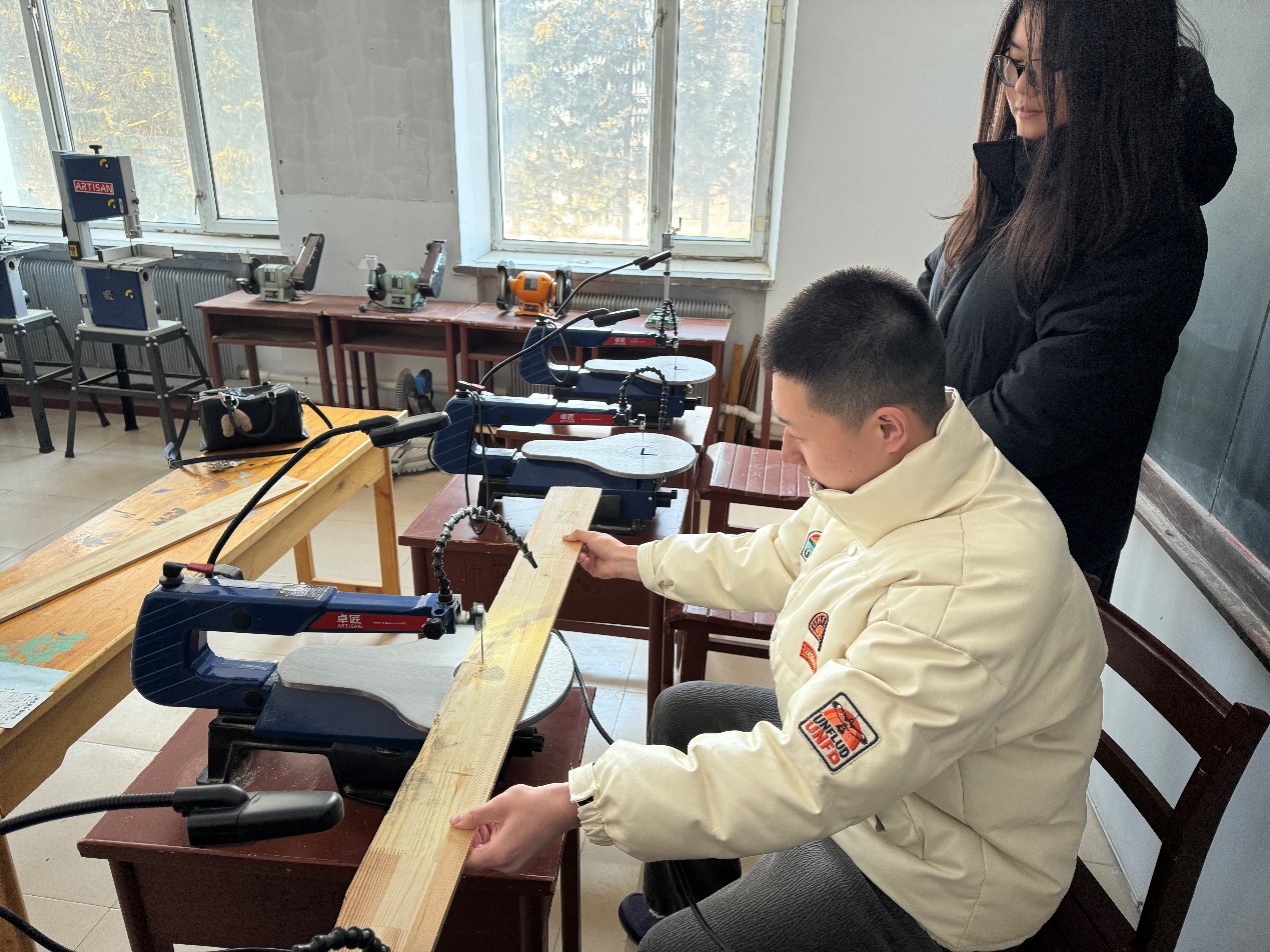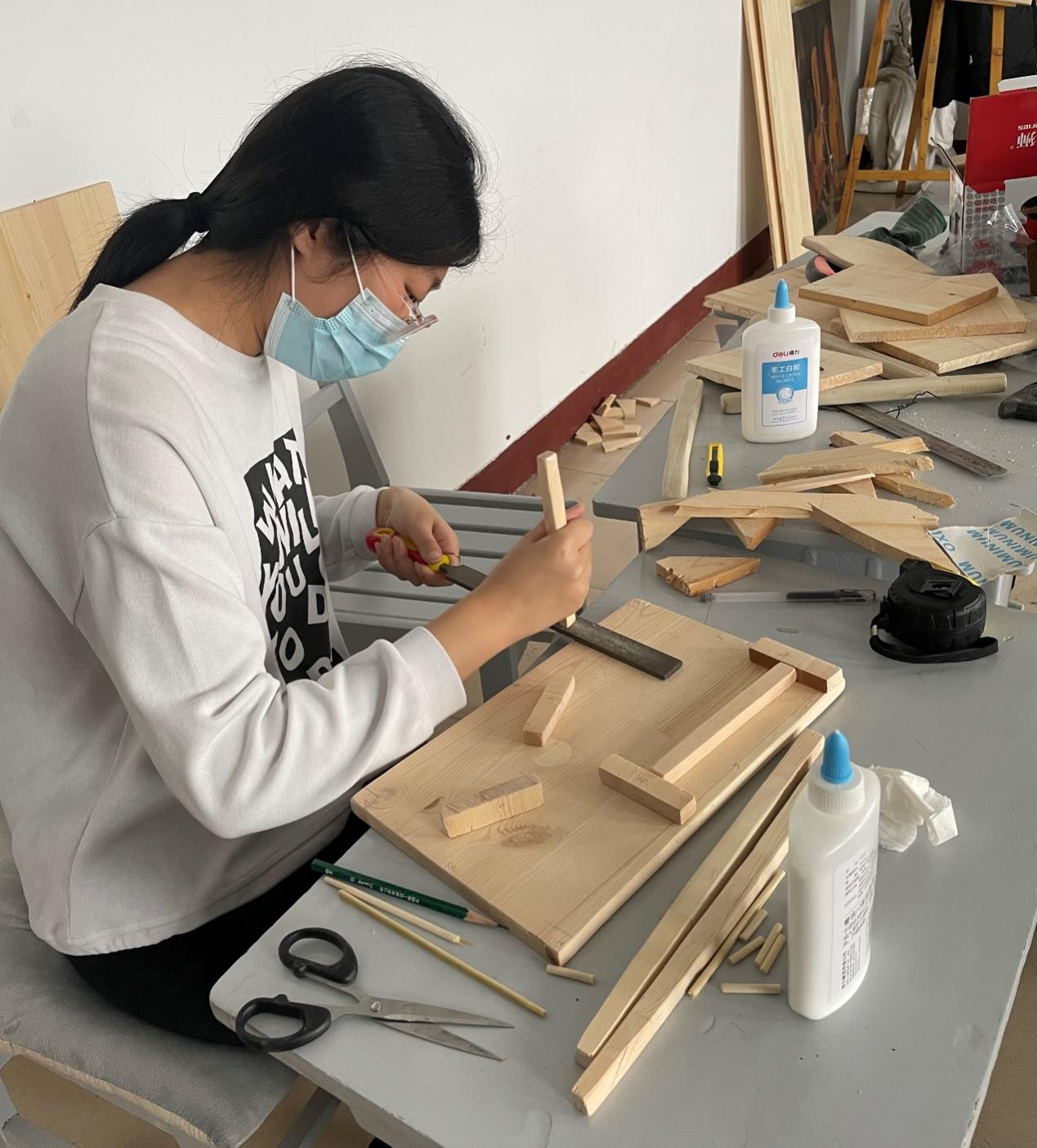 学生在实训室进行木制品制作
