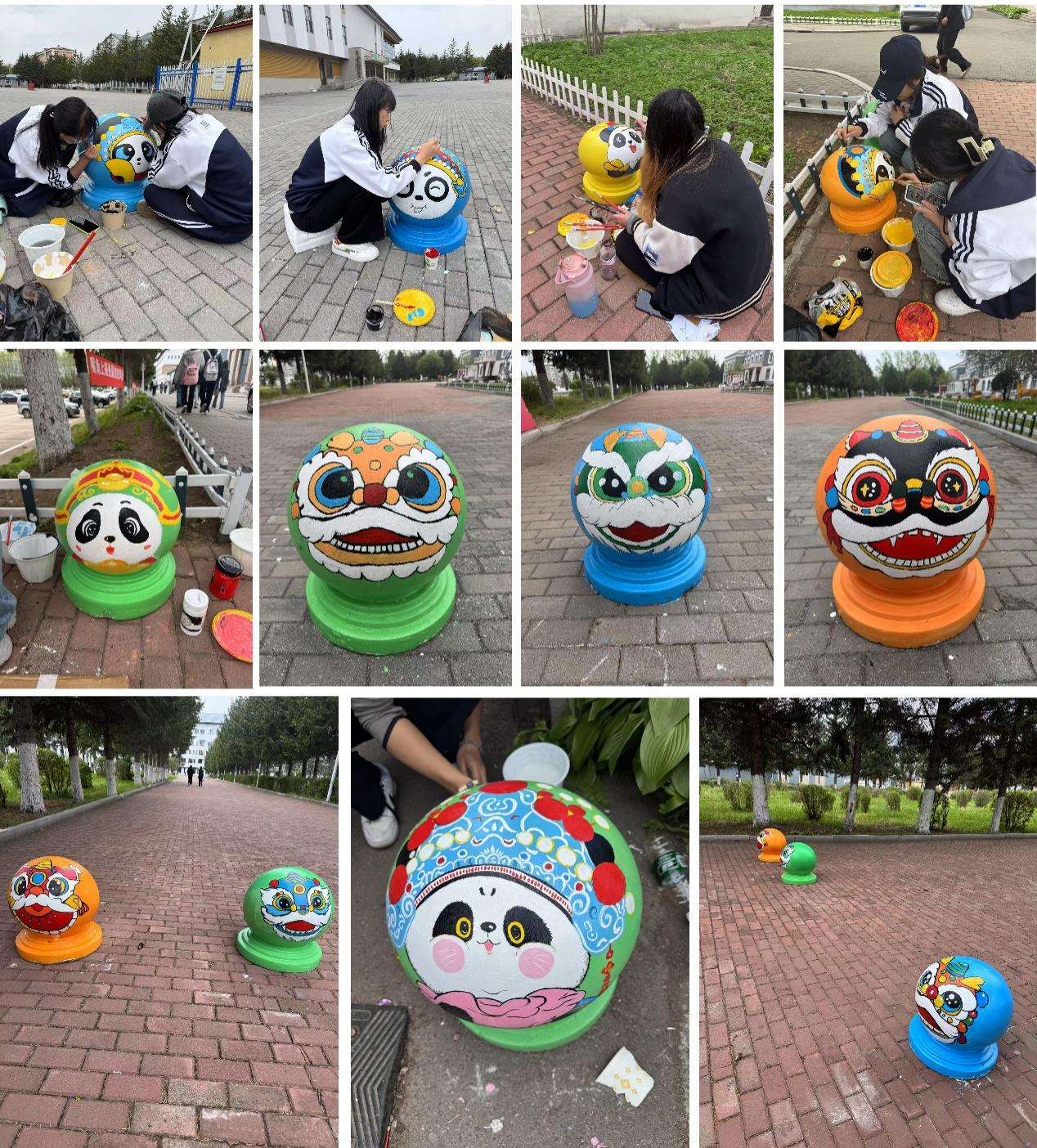 实践活动三:在校园内开展绘画技法劳动实践活动,师生们以传统脸谱、国宝熊猫为创意元素绘制校园挡车石球。将专业教学和非遗文化劳动实践相结合,创新教育教学方式,让学生在实践中更好地感悟匠心,锤炼品格,同时也是文化传承的创新实践。师生们借助石球的外形特点,构图、起形、调色、涂色等进行精心绘制,在绘制过程中,需要极具耐心、细心和专注力,在大家的努力下,一个个生动的形象出现在石球上,使石球瞬间充满了生命的力量。通过绘画实践,使学生了解和传承传统文化的同时,能够结合现代审美和创意,对传统文化进行创新和发展,引导学生树立正确的劳动观,促进学生全面发展、健康成长。