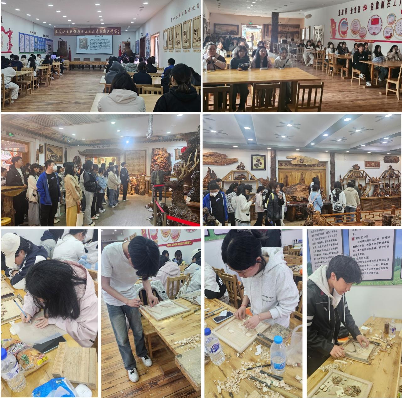 实践活动一:在兴安木艺产业学院实训基地美江木艺有限责任公司开展,首届传统工艺大国非遗工匠王美江为学生们打造“可触摸的非遗课堂”,一是以“匠心流韵绘兴安”为主题,为同学们讲解非遗木拼画、北沉香、山核桃的历史传承、发展和制作工艺流程,并希望通过此次活动让更多年轻人积极投身于非遗保护,为传承发展注入青春活力。二是通过参观非遗展厅,感受非遗文化,激发探索兴趣,提升创新意识,增强传承、弘扬和保护非遗的责任感。三是在实践环节王美江大师用木材边角料拼贴非遗木拼画,并与学生们一起现场制作。参与活动的同学们纷纷表示,这种“手把手”地教学拉近了非遗与他们的距离,真正感受到了非遗的魅力。近年来,伊春美江木艺以非遗木拼画精品实践课为活动内容,将非遗文化融入学校课程体系中,通过课堂、实践、活动等形式,持续推进应用型技术技能人才培养创新实践,增强学生的文化认同感和传承意识。
