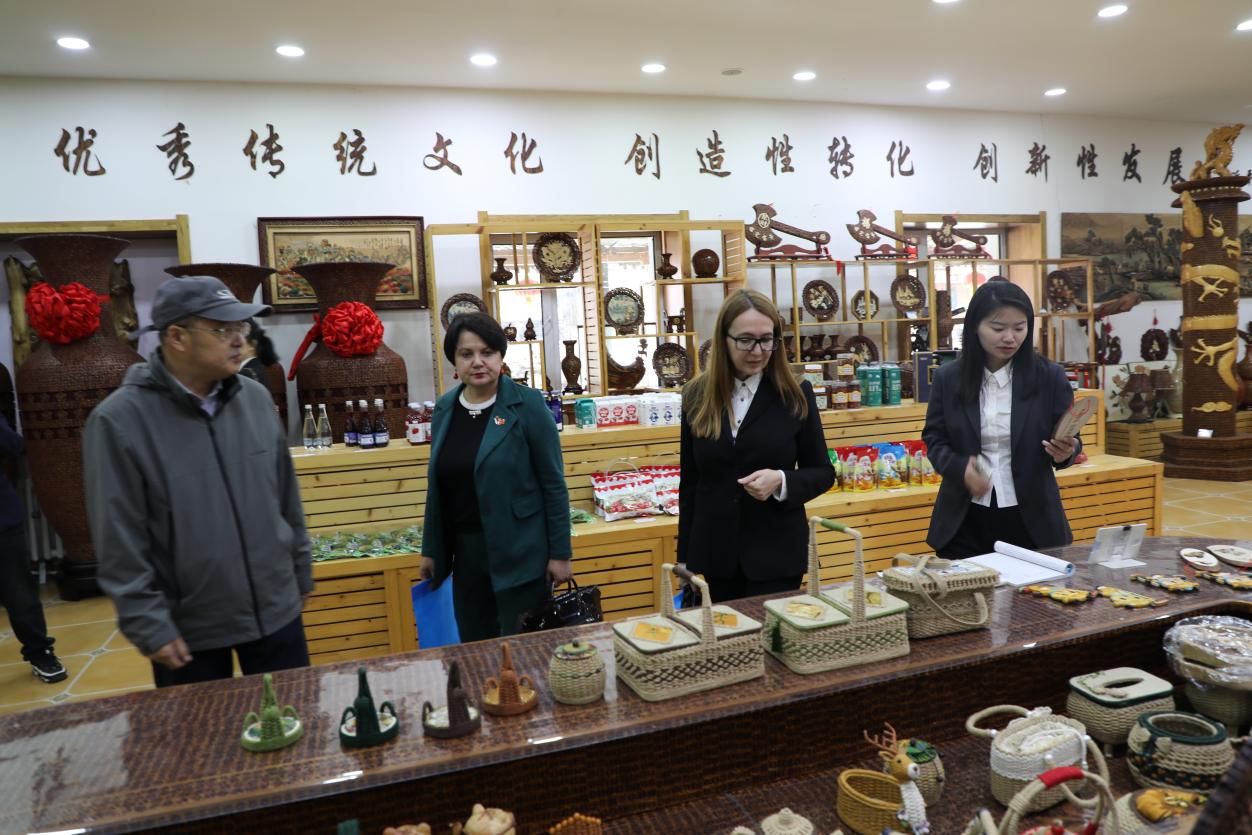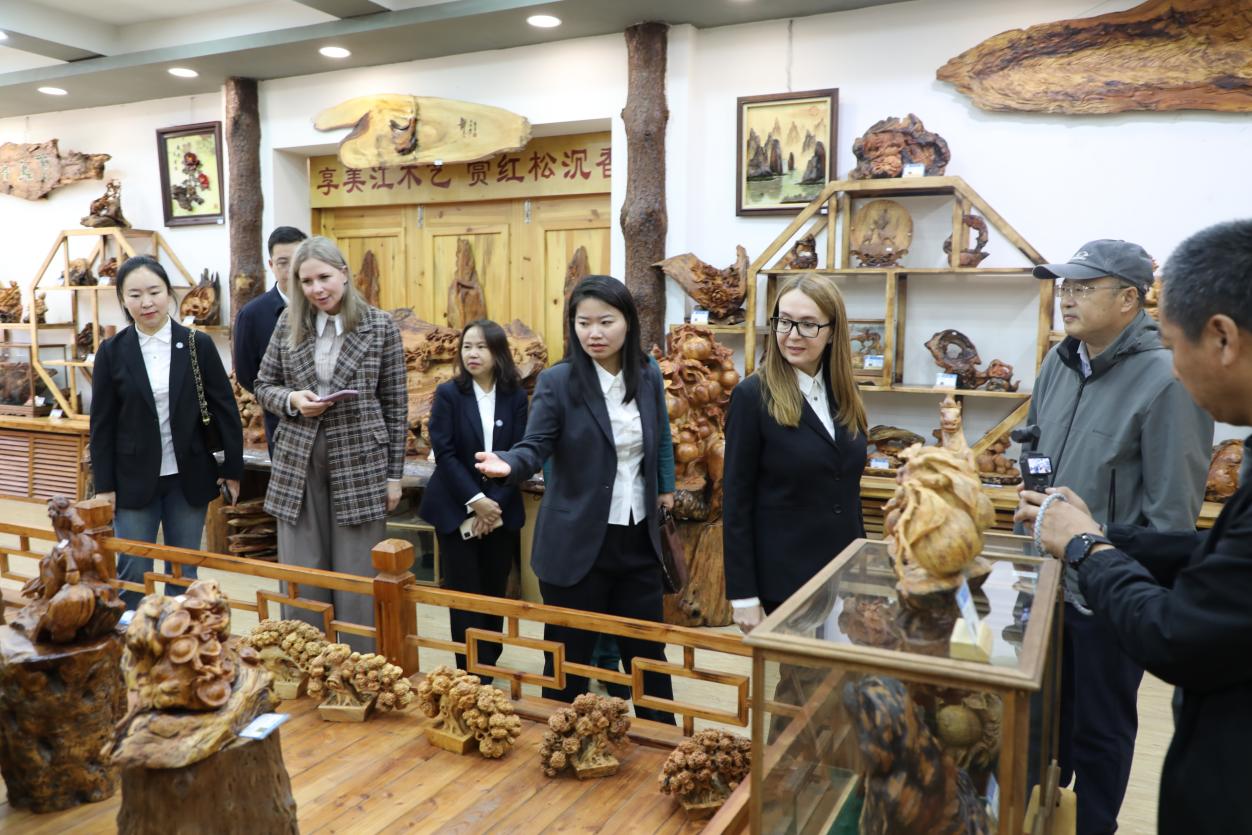 随后,巴热诺娃一行重点参观了森林文化艺术创意展示中心。走进展示中心,一件件精美的木艺作品让人眼前一亮,北沉香摆件纹理独特、香气淡雅,木拼画作品色彩层次丰富、画面栩栩如生,山核桃创意作品则将山核桃变废为宝,展现出浓郁的北方森林文化特色。
