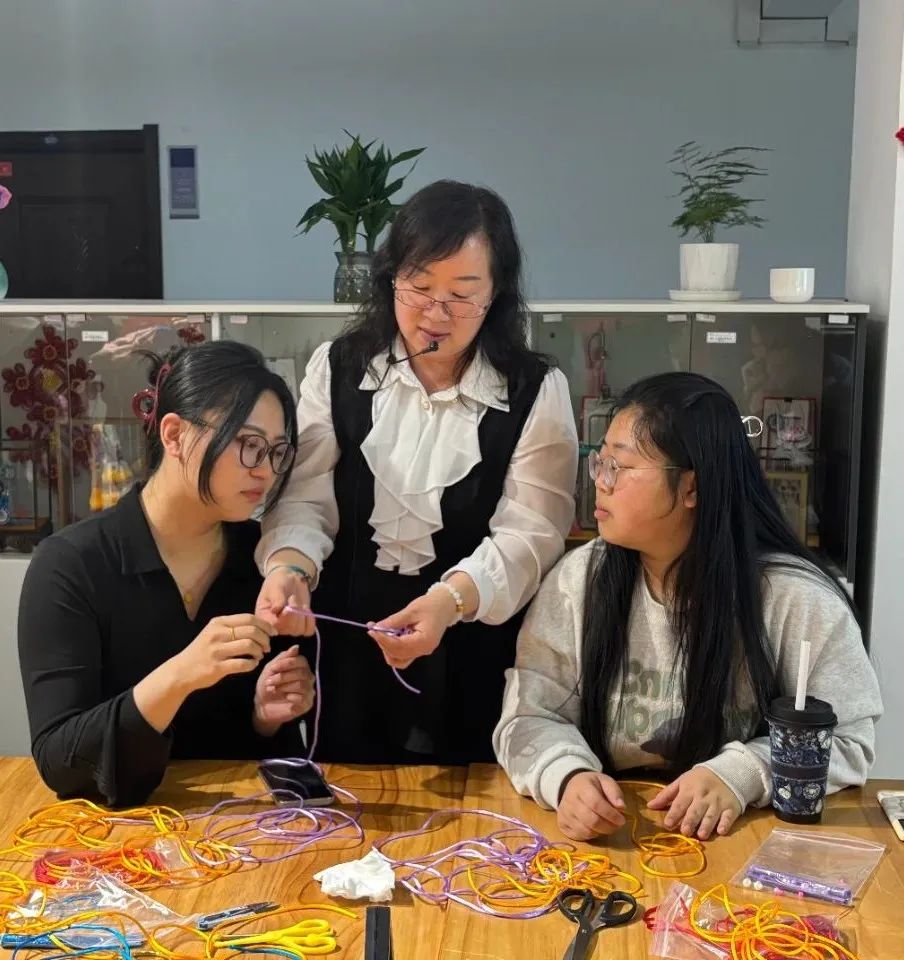 动手实践环节,于老师边演示边指导,不时俯身为学员们调整手势,细心为学员们答疑解惑,并鼓励大家要勇于创新,尝试非传统的色彩组合,让千年绳艺绽放青春光芒。