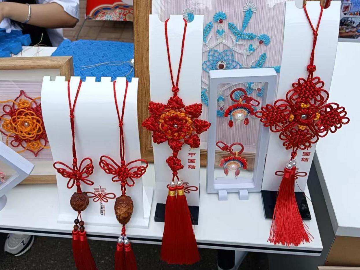 当同学们奔跑至第二个站点,便能邂逅中国结社团成员们专注编织的身影。现场陈列着许多精致的凤冠花嫁,还有融合地域特色的雪花,蕴含着吉祥平安寓意的四季平安、八方进宝等中国结作品,流苏摇曳间尽显传统工艺之美,传统工艺的雅致与青春跃动的气息在此交融,为活力四射的校园跑增添了一抹浓厚的文化底蕴。
