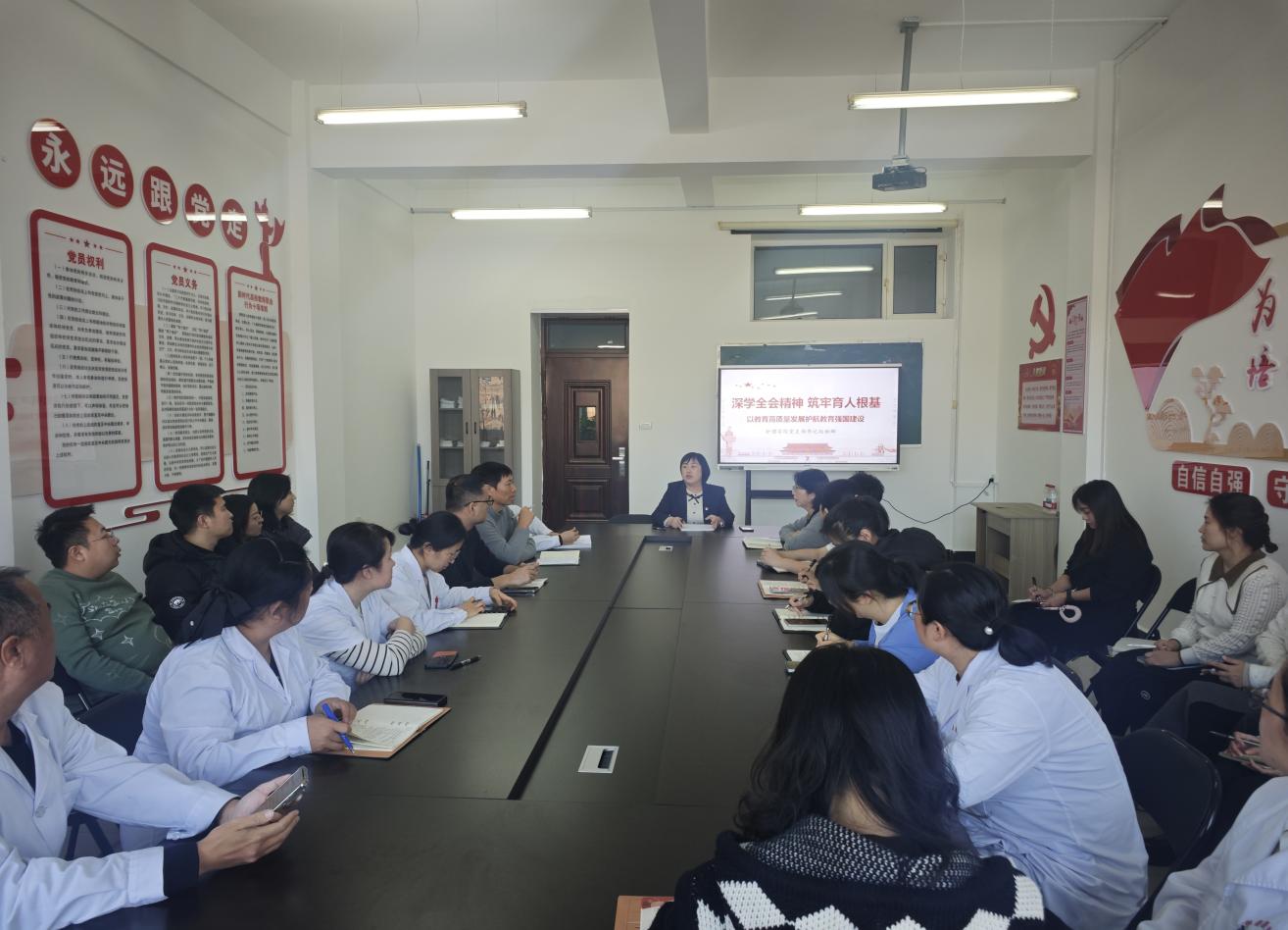 为深入学习贯彻党的二十届四中全会精神,引导全院师生将思想和行动统一到党的二十届四中全会部署上来,12月17日下午,护理学院党支部举办专题学习,护理学院党支部书记赵丽娜分别为教师、学生作党的二十届四中全会精神主题宣讲。学院全体教职工、部分学生干部、入党积极分子参加了学习活动。